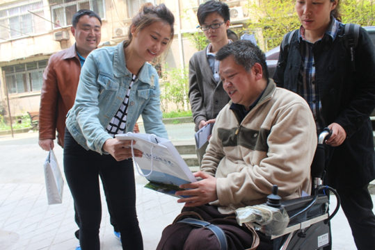 4月1日一大早,同学们便乘车赶往武昌车辆厂宿舍。当方俊明从家里摇着电动轮椅到巷子口,来到大家面前时,这位面容和善、语言亲切的感动中国人物,却让大家感到一种莫名的紧张和拘谨,赵珊珊说,也许是因为发自内心的崇敬吧。大家立即将方俊明抱进车里,再把重达100多斤的轮椅抬上去。“真是麻烦你们了”方俊明连声向同学们道谢。在上车时,同学们首先感觉到的是方俊明的不幸,因为行动的不便,可以想象他日常生活的艰难。汤晶晶同学后来回忆,在帮助他上车的时候,我们可以感觉到他的难受,想到每天都要经历这样的过程便是一种煎熬。