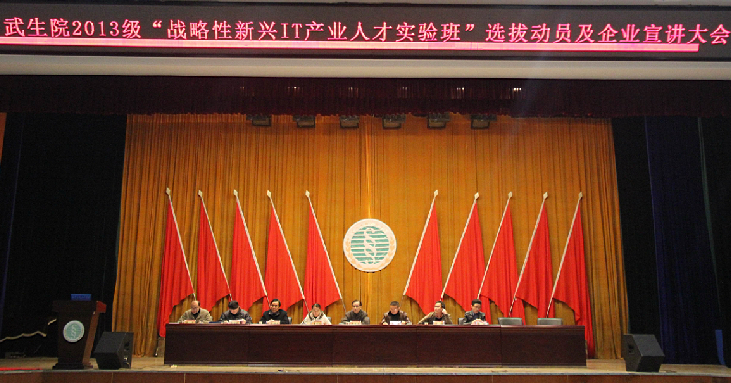 会上,教务处副处长吴杰宣读了《武汉生物工程学院2013级“战略性新兴IT产业人才实验班”实施方案》;计算机与信息工程系系主任李腊元教授宣读了《武汉生物工程学院2013级“战略性新兴IT产业人才实验班”学生选拔工作方案》。武汉软帝科技责任有限公司总经理李杰、武汉光谷软件人才与技术服务有限公司总经理芦纲、武汉百捷集团教育投资管理有限公司技术总监郭靖等企业代表出席会议并先后发言。