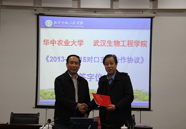 2009年7月4日,湖北省启动“中央部属高校与地方高校对口支持与合作计划”,我校与华中农业大学“结亲”。几年来,通过聘任“彩虹学者”和学科带头人,指导我校教学科研;合作成立“武汉生物工程学院教师培训学院”,选派青年管理干部和骨干教师到华中农大挂职锻炼学习;引进华中农大国家精品课程资源;联合培养硕士研究生;文献资源互借互享等多种途径,抓重点项目,以点带面,推动整个支持合作计划的落实,取得了显著成效。去年12月,华中农大和我校分别被湖北省教育厅评为“中央部属高校与湖北省属高校对口支持与合作工作先进单位”一等奖和二等奖。