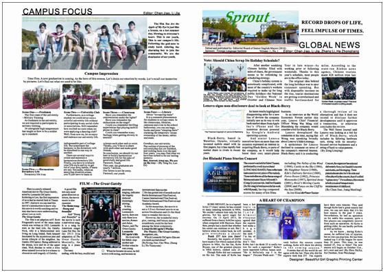 经过师生的共同努力,英文报的编辑工作终于全面完成。看到自己动手创办的两期英文报出现在了院里的展板上,同学们内心的喜悦和激动之情难以言表。三班的吕哲同学说:“在这个过程中,我和所有参与其中的同学都深有感触,一方面是对报纸整个制作的过程有了一定的了解,同时也学到了一些关于策划、文字编辑、排版等方面的知识,对于我们英语专业学生就业又多了一个方向。另一方面,在此过程中,学生之间、师生之间有很多合作交流的机会,对于团队协作意识、动手能力以及人际沟通方面能力的培养都有积极的促进作用”。