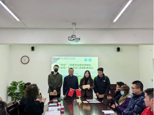 本网讯(通讯员 张若驰)2023年12月8日,学校为树立典型,表彰先进,鼓励教师员工转型发展成为“双师型”教师,落实高质量育人的任务,对“两馆”(创新创业教育博物馆、校史馆)设计有功的教职工进行表彰和座谈慰问活动在西裙楼312会议室召开。本次活动由教务处处长刘春侠主持,校务委员会顾问赵正洲、校党委副书记、副校长孔德文、人事处负责人何超杰、艺术学院党政班子成员、受表彰的教师及各教研室教师代表参会。