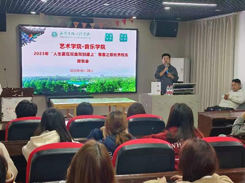 (通讯员:李源 杜婧宇)2023年10月25日艺术学院·音乐学院在校美术馆举办“人生赢在双自双创路上”优秀校友报告会,艺术学院·音乐学院特邀优秀校友万彦辛作以“人生赢在双创路上”为主题的讲座。学院2023级新生参会,会议由校友联络员李源老师主持。