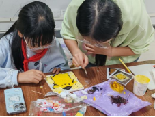 活动现场,志愿者们提前备齐了漂漆团扇与纸浆画所需材料。在讲解环节,志愿者借助生动的图示和趣味比喻,分别介绍了漂漆团扇“水拓晕染”的独特技法与纸浆画“立体塑形”的创作要点,通俗易懂的讲解迅速点燃了孩子们的创作热情。