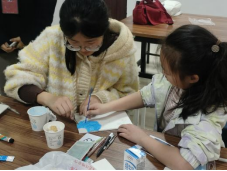 进入实操阶段,志愿者们耐心指导小朋友进行色彩晕染与纸浆塑形。小朋友们全程兴致盎然,或专注调配漆色,或认真堆砌纸浆,在欢笑声中,一把把团扇上呈现出独特的水拓纹样,一幅幅纸浆画作也渐渐展现出斑斓色彩与纯真童趣。大朋友与小朋友互动融洽,欢声笑语萦绕全场,温馨的氛围让艺术传递更有温度。