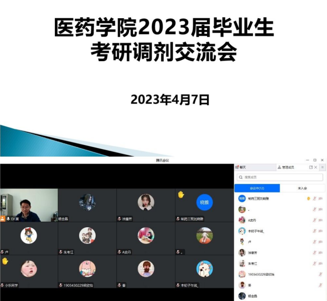 本网讯(通讯员 杨金晶)为帮助医药学院学子更好的进行调剂选择,拓宽信息获取渠道,医药学院于4月7日上午通过线上会议开展2023届毕业生考研调剂交流会,党总支常务副书记史丹、常务副院长黄帅、毕业班辅导员及需要调剂的学生参会。