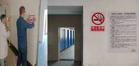 本次禁烟活动,除教学楼外对所属实验室场所也进行全面排查,重点检查实验室内部是否存在安全隐患,对实验楼厕所内抽烟情况进行劝诫及禁止。在实验楼厕所外张贴相应的制度及警示标识,针对实验室分楼层进行安全巡查,每层实验室设立“禁烟劝导员”,不定时的对所属楼层厕所进行巡查,加大对实验室抽烟情况的巡查及排查,力争做到无烟教学环境。本次禁烟活动对教师也进行了督促,动员教师利用安全教育时间对学生加强禁烟事项教育,全体教职工和学生均为监督者,加强禁烟监管,监督别人的同时监督自己;同时完善惩处措施,对违反规定吸烟的师生,给予相应的惩处,主要以提醒教育为主。签订“医药学院全面禁烟告知书”,做到人人知晓,人人落实。