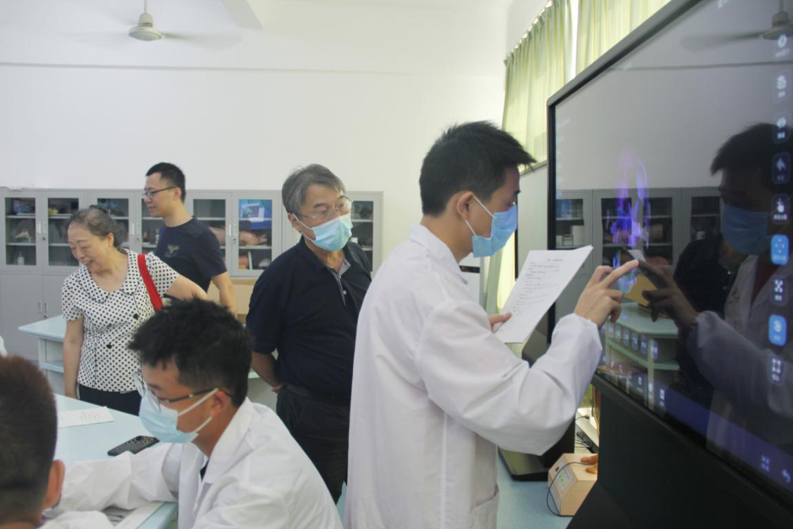 图为常务副校长顾豪爽教授(后排左二)、校党委常委、医药学院院长柯贤炳(后排右一)与教育教学督导室老师认真聆听医药学院王海梅副教授的《人体解剖生理学实验》课。