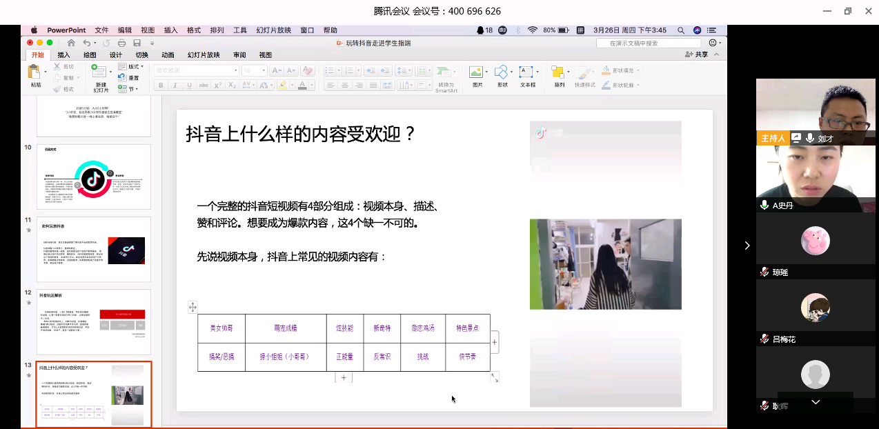 本网讯(通讯员 肖亚慧)3月26日下午3点,药学院辅导员刘才,通过腾讯会议为药学院全体政工干部,开讲了主题为《玩转抖音走进学生指端》药学院新学期自主培训的第一课。