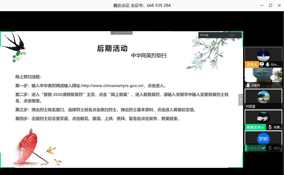 本网讯(通讯员 肖亚慧)4月4日上午10点,线上会议室里一片寂静。来自药学院党站80余名学生党员、积极分子集体在为抗击新冠肺炎疫情斗争牺牲烈士和逝世同胞进行深切哀悼。