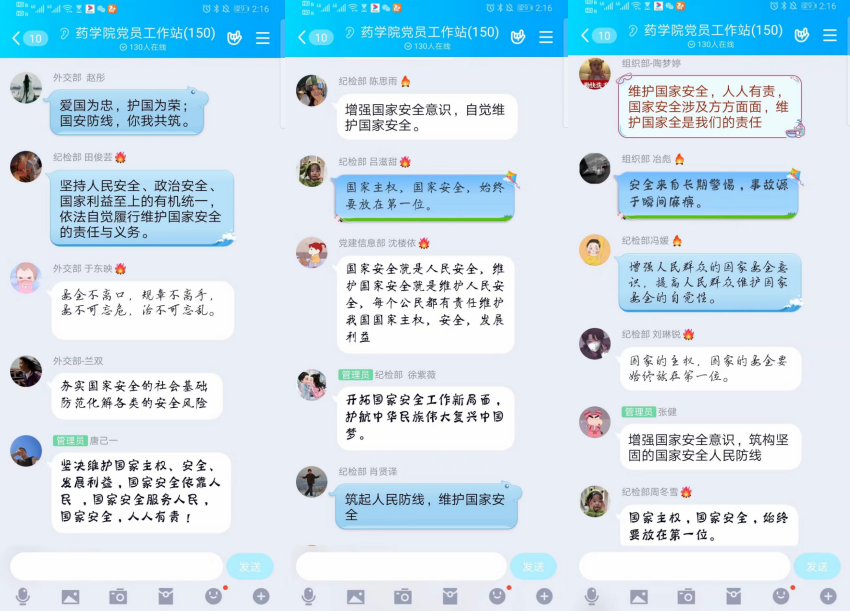 会议最后,开展了增强国家安全意识,维护国家安全能力标语警句宣传。这次的活动得到了医药学院党站同学们的纷纷响应,医药学院党员工作站的群内不断涌出爱国护国的警示语,每一条警示语都是医药学院党员工作站全体成员的深深爱国情怀,更是医药学院全体成员对爱国行为的一种完美的诠释。