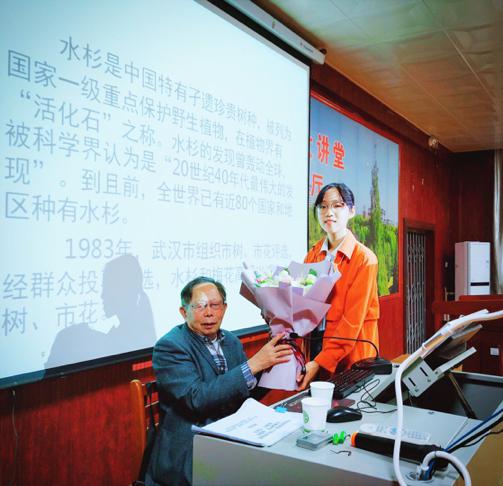 19级中药专业2班班长杜慧薇在讲座结束后代表全体同学向詹教授献上了百合花致敬,她谈到:“我们全班同学了解到詹教授是湖北省中医大师、国医楷模,也是我们药学院的创始人,现已有80多的高龄仍然牵挂着我们,给我们上课,大家都非常的感动,决定一起买一束百合花向詹教授表达感谢和敬意,今天听了詹教授一个半小时的讲座,使我对我们国家自己的医药学文化充满了自豪和信心”。