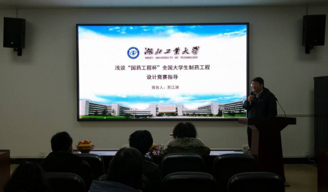 (通讯员 黄帅 李志勇)12月10日下午,为进一步加强药学院一流本科专业制药工程专业的建设,推动药学院学生科研工作的发展,带动药学院老师们参加全国性制药工程大赛的热情,湖北工业大学苏江涛教授应药学院柯贤炳院长的邀请来我校做了“制药工程专业建设及全国制药工程大赛交流”的报告。苏江涛教授做为湖北工业大学生物工程与食品学院副院长,为药学院老师系统介绍了湖北工业大学制药工程专业建设的发展规划与现状。据了解,苏江涛教授带领学生团队从2013年开始参加全国性制药工程大赛,连续多年获得国家级一、二、三等奖;苏教授同时为我院老师们作了详细的“国药工程杯”全国大学生制药工程设计竞赛的指导培训。