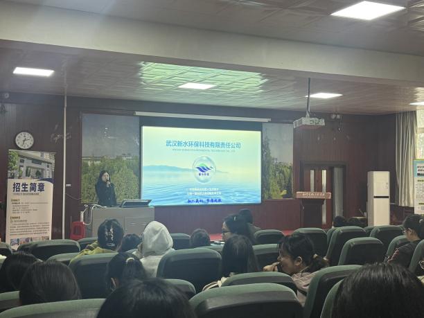 宣讲会上,新水环保技术总监郭小亮博士介绍了公司聚焦生态治藻与水质提升及去污创新机制理念,深耕环保赛道;公司的发展历程、核心业务优势以及建设的绿色农药全国重点实验室。重点讲解了研发、检测、生产、应用技术、销售、市场、行政、财务等8个岗位需求。答疑解惑环节,学生围绕”招聘技能技术要求“、”实习转正机制”、“项目实操机会”等提问人事总监逐一解答,现场气氛热烈。