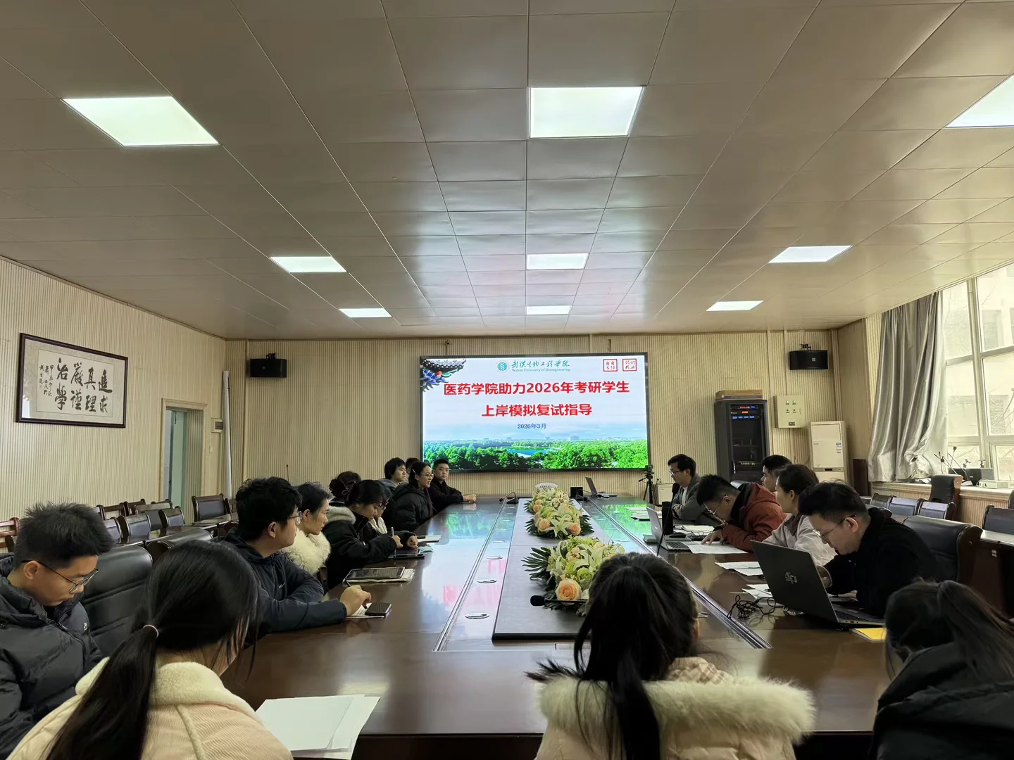 本网讯(通讯员 陈海浪,刘欢欢)为提升我院2026届考研过线学生复试竞争力,帮助学子扫清面试障碍,3月19日下午2:30至17:30,我院在一号楼西1207教室举办考研复试一对一模拟指导活动。活动由医药学院常务副院长黄帅主持,尤园、程鹏、周元保、陈金波、宋青等专业教师组成面试导师团,为全体考研过线学生提供精准指导。