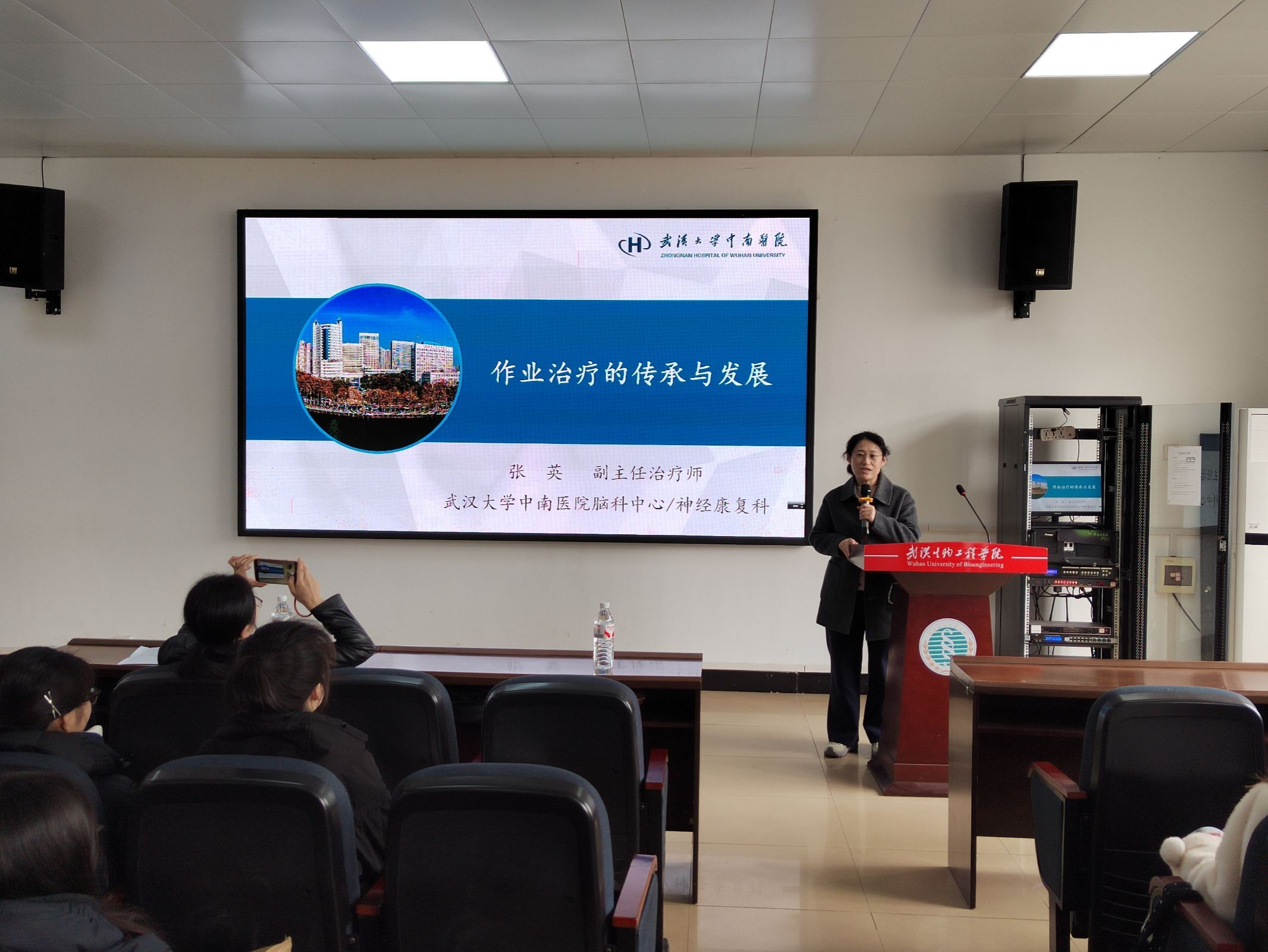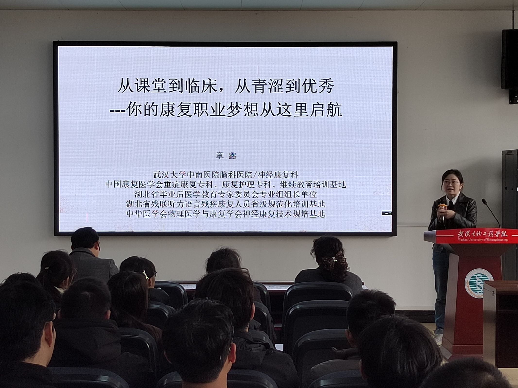 章鑫主任作为神经康复科副主任,结合自身丰富的临床与科研经验,系统介绍了武汉大学中南医院在康复医学领域的雄厚实力与前沿探索。她从医院“一院两区”的发展格局、国家重点临床专科建设、到多项国家级科研项目的推进,生动展现了现代康复医学的广阔前景。她通过丰富的案例图片,展示了上肢机器人、脑机接口、虚拟现实等新技术在康复治疗中的应用,帮助学生更直观地理解专业发展前沿。同时还分享了医院在昏迷促醒、吞咽功能障碍、远程康复等方面的最新技术应用,鼓励学生立足课堂、放眼临床,努力成长为兼具专业能力与人文情怀的优秀康复人才。