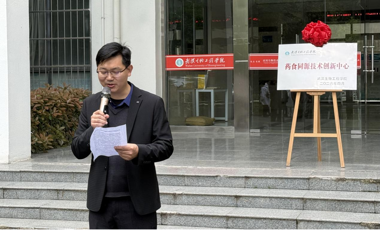 本网讯(通讯员 李洁)2026年4月15日上午11时,武汉生物工程学院“药食同源技术创新中心”揭牌仪式在应用生物技术研究中心隆重举行。副校长柯贤炳教授、学校科技委特邀委员陈勇教授、科学技术发展处处长刘国武教授、医药学院常务副院长黄帅教授,以及医药学院、生命科学与技术学院、食品科技学院师生代表共同出席,见证这一重要时刻。仪式由刘国武处长主持。