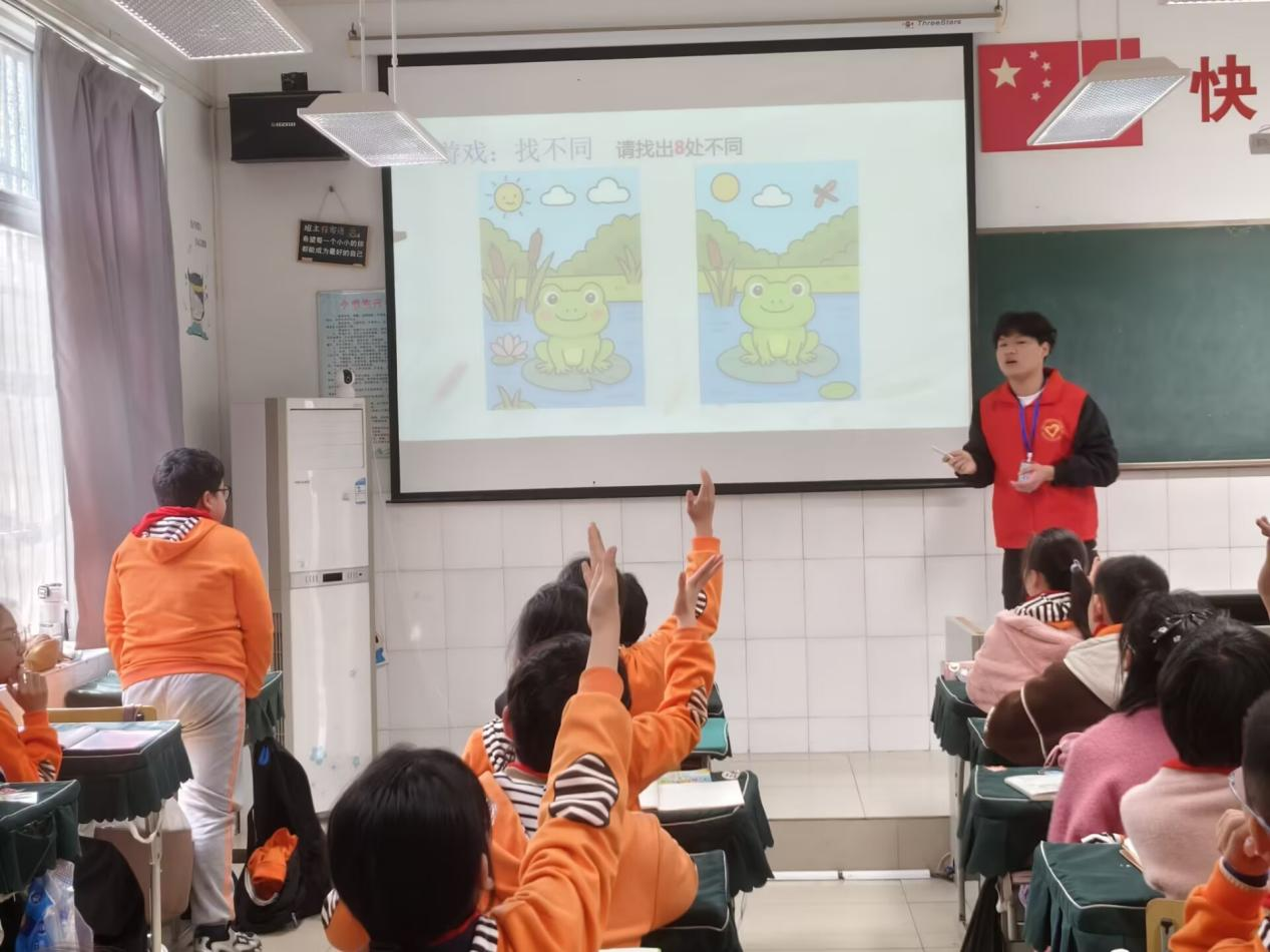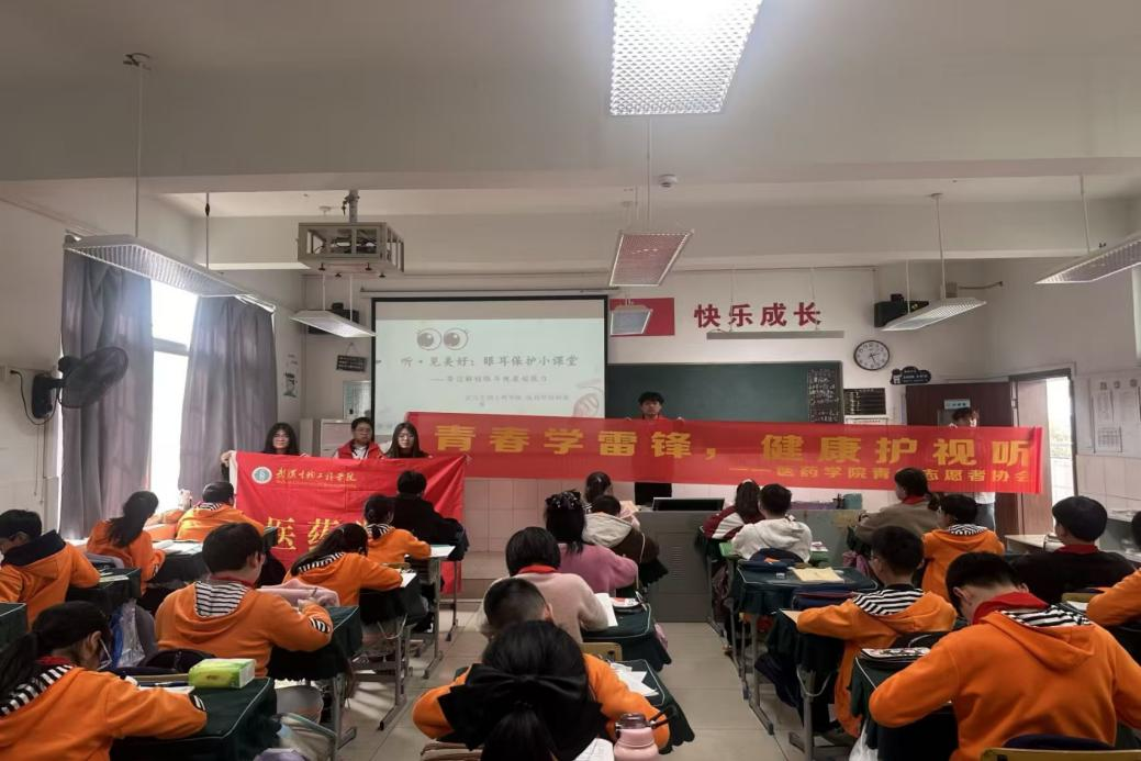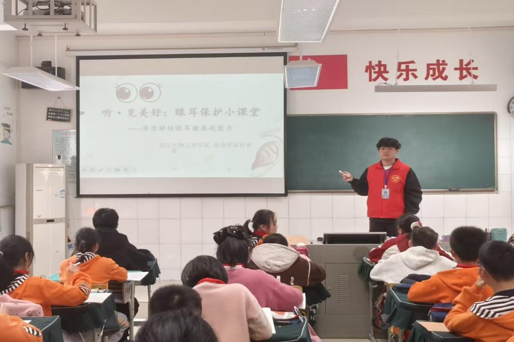 本网讯(通讯员 肖亚慧 范诗琪 摄影 旷贤能)2026年3月25日下午,为弘扬雷锋精神,践行志愿服务理念,医药学院青年志愿者协会的同学们怀揣着科普热忱,走进武汉生物工程学院钱学森小学,开展以“眼耳健康守护”为主题的公益宣讲活动。本次活动由志愿者徐高同学主讲4名志愿者同学协同配合,为六年级30余名孩子们带来一场生动有趣的眼耳健康知识课。