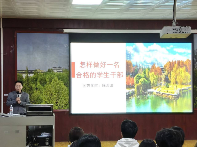 开班典礼后,团校第一讲正式开讲。医药学院党总支副书记陈海浪以 “大学生团员如何发挥模范带头作用向党靠拢” 为主题,围绕学生干部概述、角色定位、素质培养及注意事项等内容展开授课,结合鲜活案例与实际工作,深入浅出、贴近学生,让全体学员深受启发。