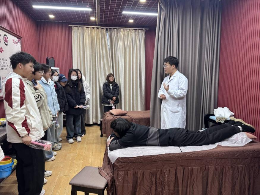 随后,刘青晖老师转向推拿技法的教学。聚焦推拿 “疏通经络、调和气血” 的核心原理,逐一拆解推、拿、按、摩等基础手法的动作要领,结合人体经络分布特点,演示了针对肩颈、腰背等常见不适部位的推拿技巧。通过手把手指导、分组练习的方式,让学生亲身感受推拿手法的力度与节奏,掌握可用于日常舒缓疲劳的实用技巧。