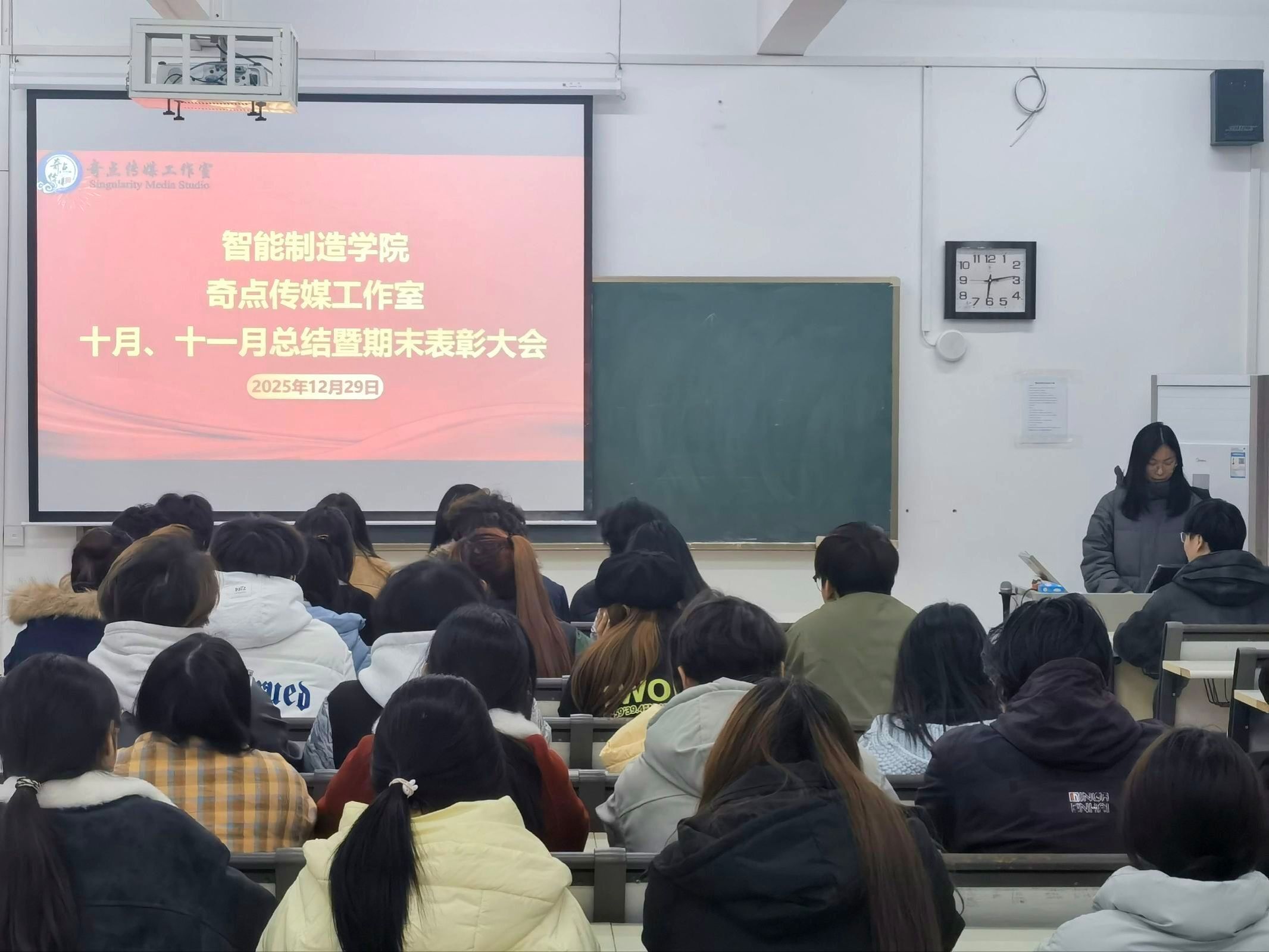 本网讯(通讯员 狄泽荣 邵雯 摄影 安昊驰 张文硕)12月29日18:10,奇点传媒工作室期末表彰大会在16号楼211教室顺利召开。奇点传媒工作室全体成员参会,本次会议由赵欣宇主持。