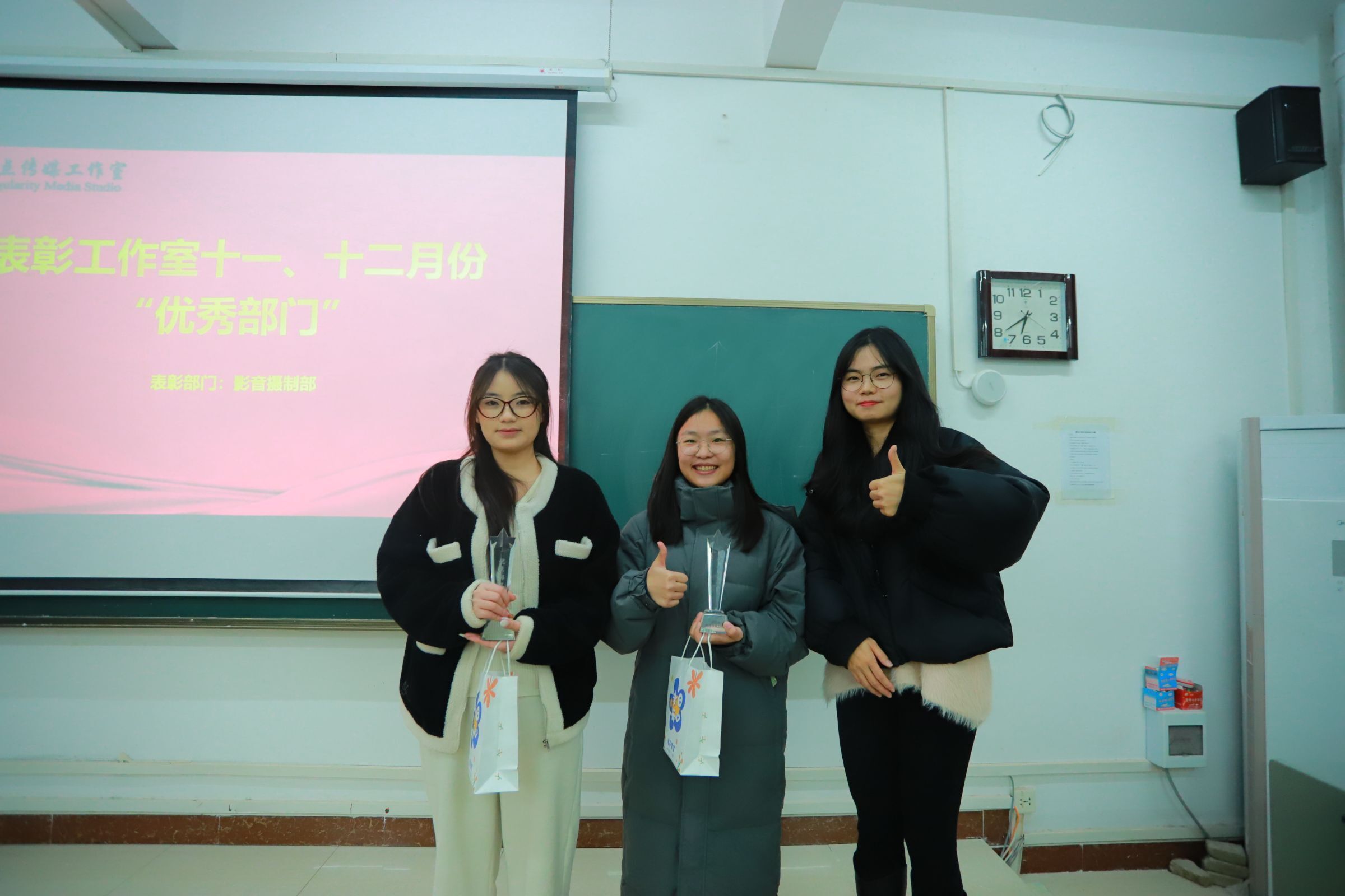 在表彰环节,工作室负责人李莹、施阳分别为本次获评“优秀部员”的成员们颁发奖状和奖品。指导老师周凯婕为本次获评“优秀部长”的杨芹、赵欣宇颁发奖杯和奖品。