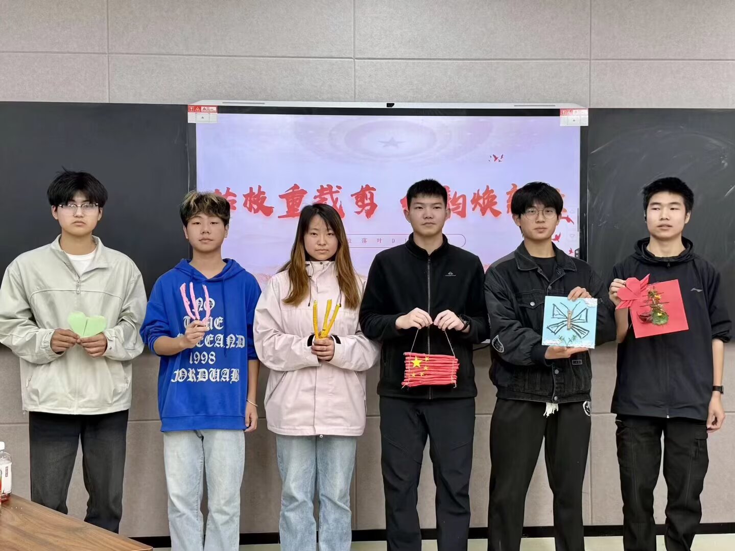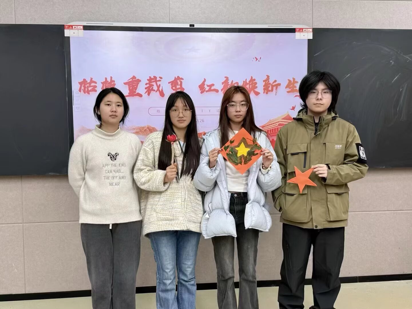 活动以小组合作形式展开。同学们充分发挥创意与巧思,将收集而来的枯枝、落叶等自然材料,通过剪、拼、贴、绘等手法,精心制作成蕴含红色意蕴的文创作品,将废旧材料被赋予新的生命与情感。制作过程中,大家交流构思、协作配合,在实践体验中深化对红色精神的理解,以行动践行环保理念。