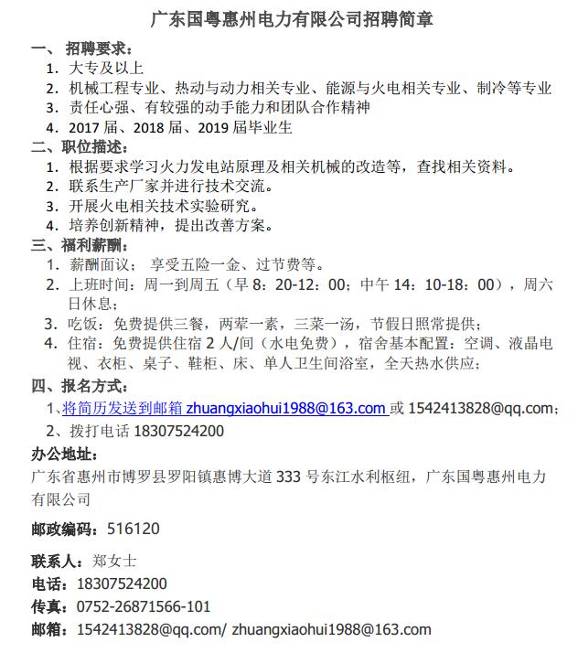 企业招聘信息----广东国粤惠州电力有限公司招聘简章