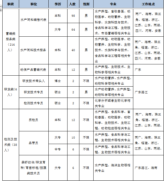 2020年校招需求人数共计372人,其中营销类 214 人,技术/检测类 38 人,研发类 6 人,服务专员类10人,生产*作类 69 人 ,财务类 14人,专业类 20 人。需求详情如下: