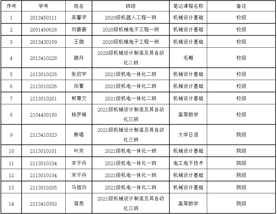根据《关于开展2021-2022学年第二学期优秀学习笔记评比展示活动的通知》文件要求,学院组织开展“优秀学习笔记”评选工作,经学生申报,班级初评,学院评审,拟推荐吴馨宇等8名同学的学习笔记为校级“优秀学习笔记”,熊唱等6名同学的学习笔记为院级“优秀学习笔记”,现将名单公示如下: