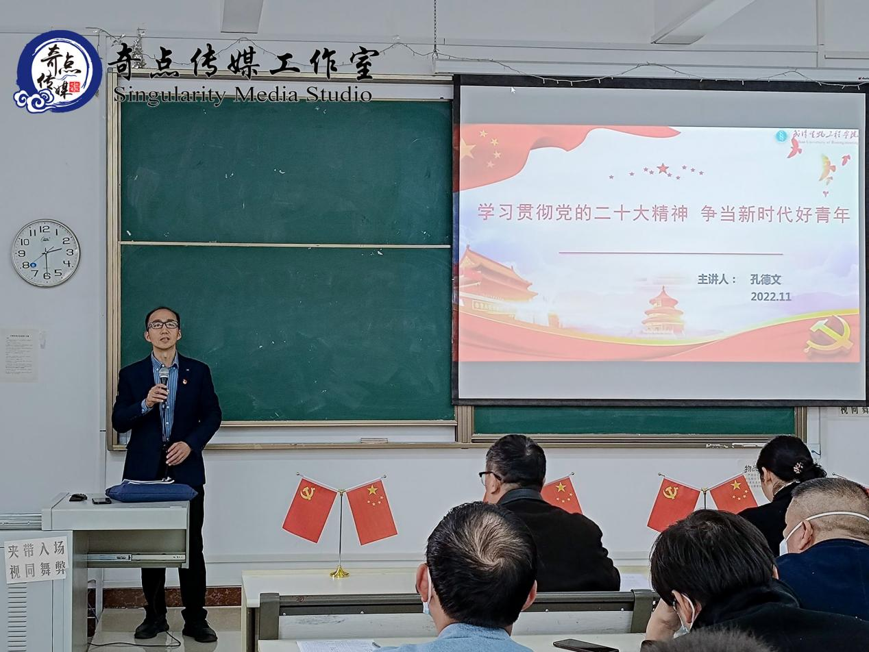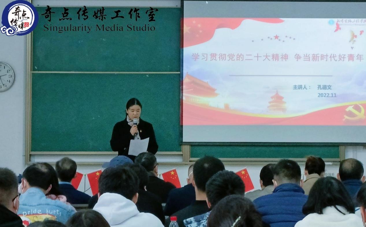 本网讯(通讯员周学渊摄影周小林、文浩)11月23日下午,机械与电子工程学院·软件工程学院在16号楼409教室开展“学习贯彻党的二十大精神,争当新时代好青年”宣讲报告会。本次宣讲报告会特邀校党委副书记、副校长孔德文作为主讲嘉宾,学院党总支常务副书记宋颖颖主持本次宣讲报告会。学院全体教职工、学生党员等参与本次会议。