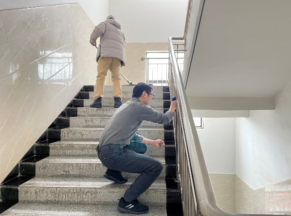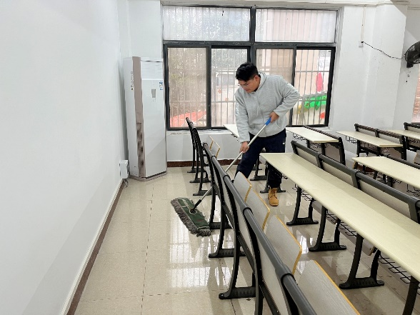 学院教职工打扫楼层、楼道和各教室