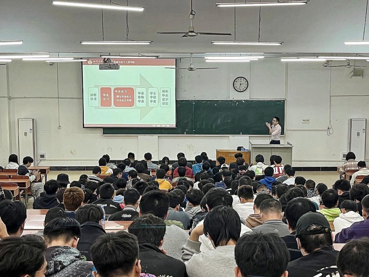 本网讯(通讯员孙馨雨、王霖 摄影陈超、胡博)为了扎实做好2023届毕业生毕业、实习工作,2022年11月7日下午,我院2023届本科毕业论文(设计)动员会暨毕业实习安全教育会在九阶四教室如期召开。机械与电子工程学院·软件工程学院院长范超毅、党总支常务副书记宋颖颖、副院长冉亮、组织员霍丹等出席本次大会。