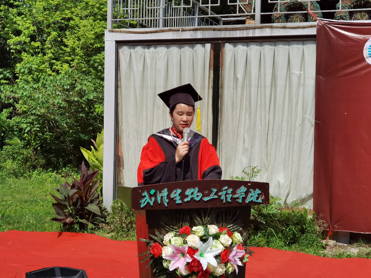 机电学院荣誉毕业生代表陶琳发言,她感谢母校老师们四年来悉心教导和精心培养,并表示作为新时代青年将继续怀着不懈努力、执着进取的信念,让优秀成为一种习惯,积极承担新时代赋予的责任和使命,以崭新的姿态迎接新的挑战。随后,在校生代表葛畅为学姐学长们送上祝福,他祝愿所有学长学姐在未来的道路上,前程似锦,一切顺利。