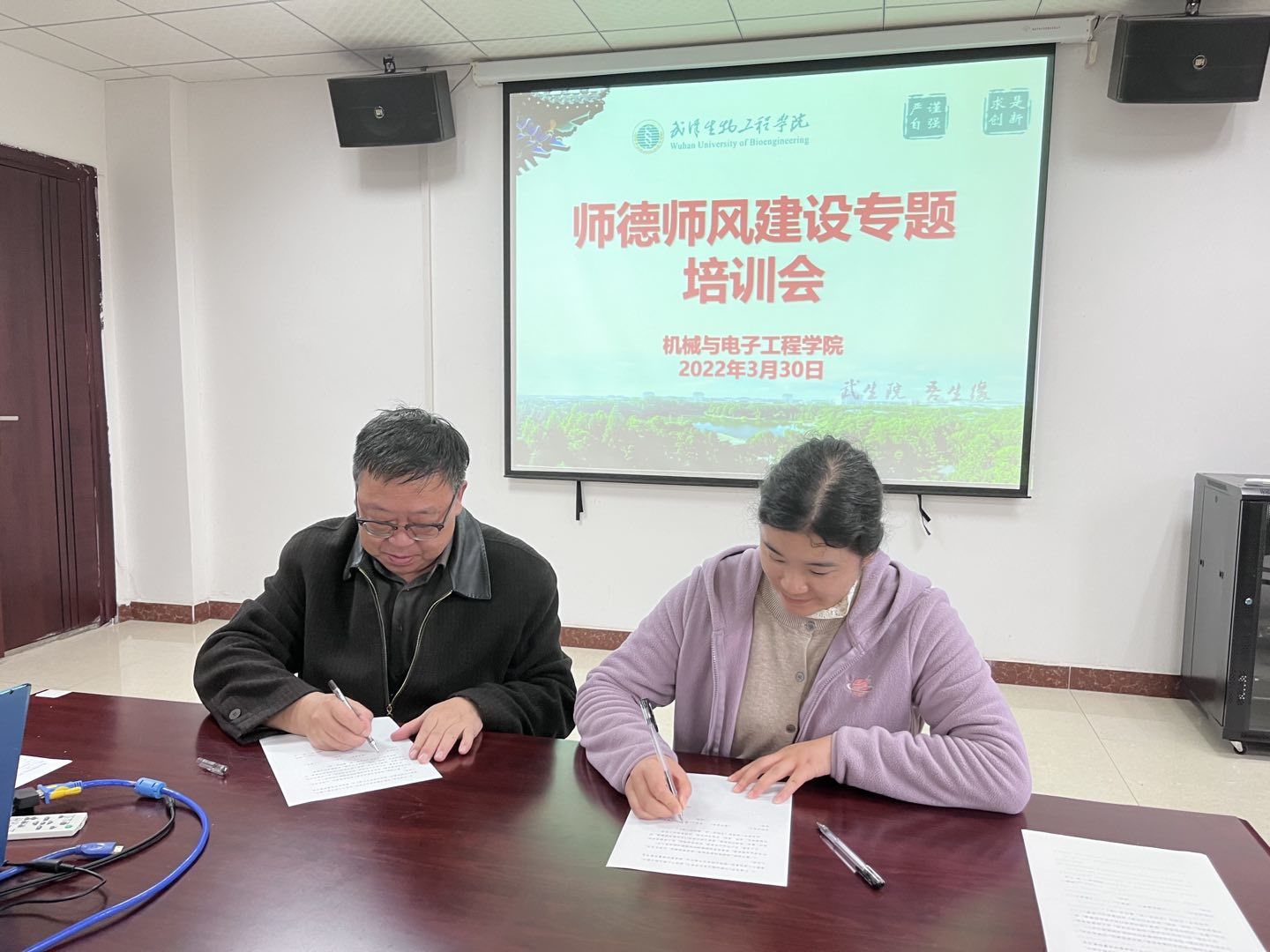 会议要求全院教职工对照武汉生物工程学院教师师德行为自查表进行了逐项自查,并签订教师师德师风公约责任状。