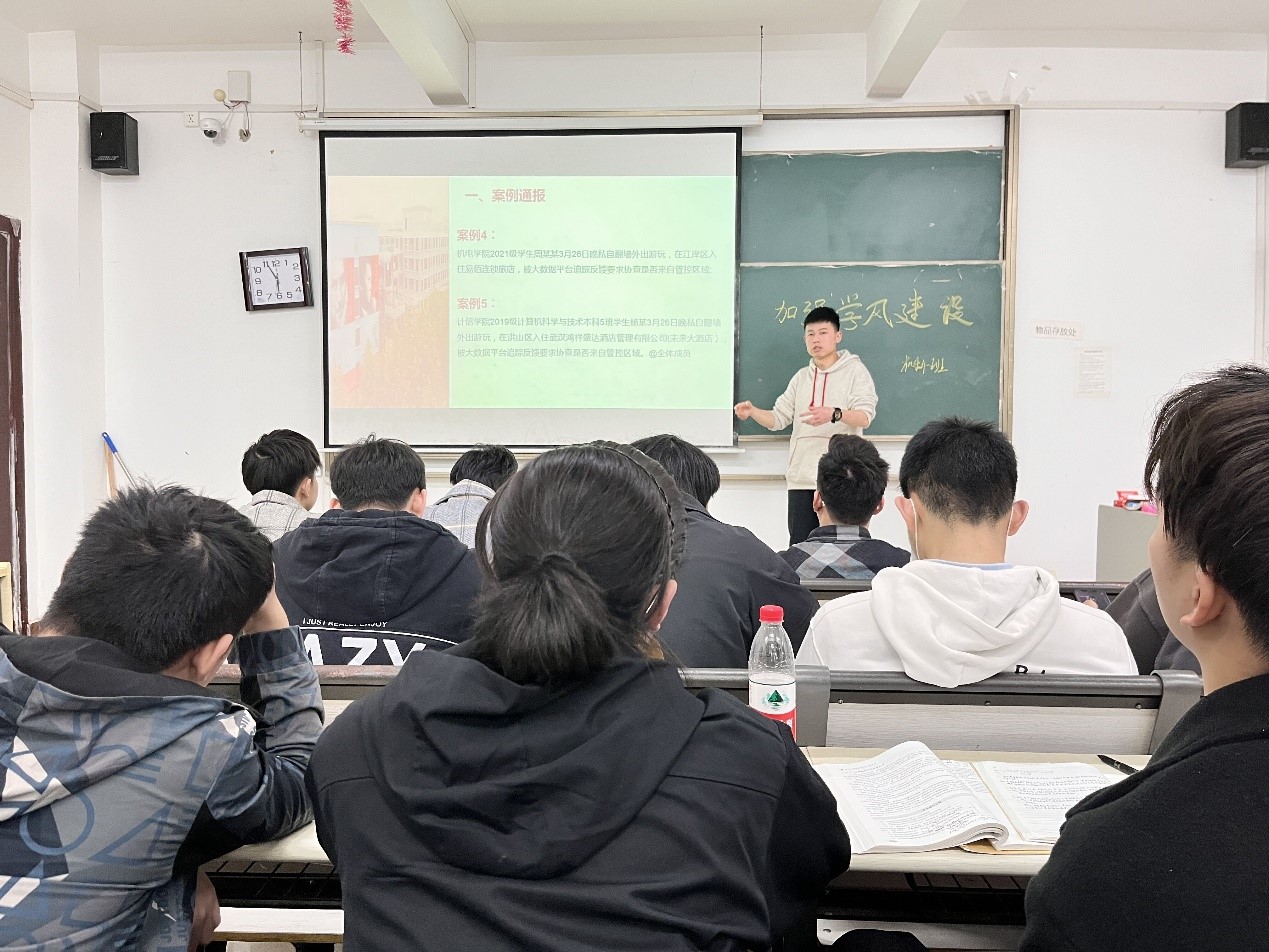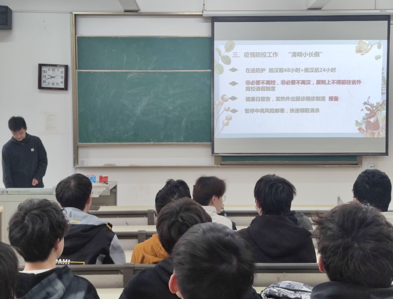 会上,各班班长引导学生做好常态化疫情防控工作,非必要不离校,非必要不离汉,保持良好的生活习惯,提醒同学们注意以下三点:第一,时刻防范电信网络诈骗;第二做好个人以及寝室的卫生,加强对春季流行病的防范;第三,外出必须办理请假报备手续(含家长发消息、知情和同意你外出,并进行安全监管),共同筑牢校园健康安全防线。