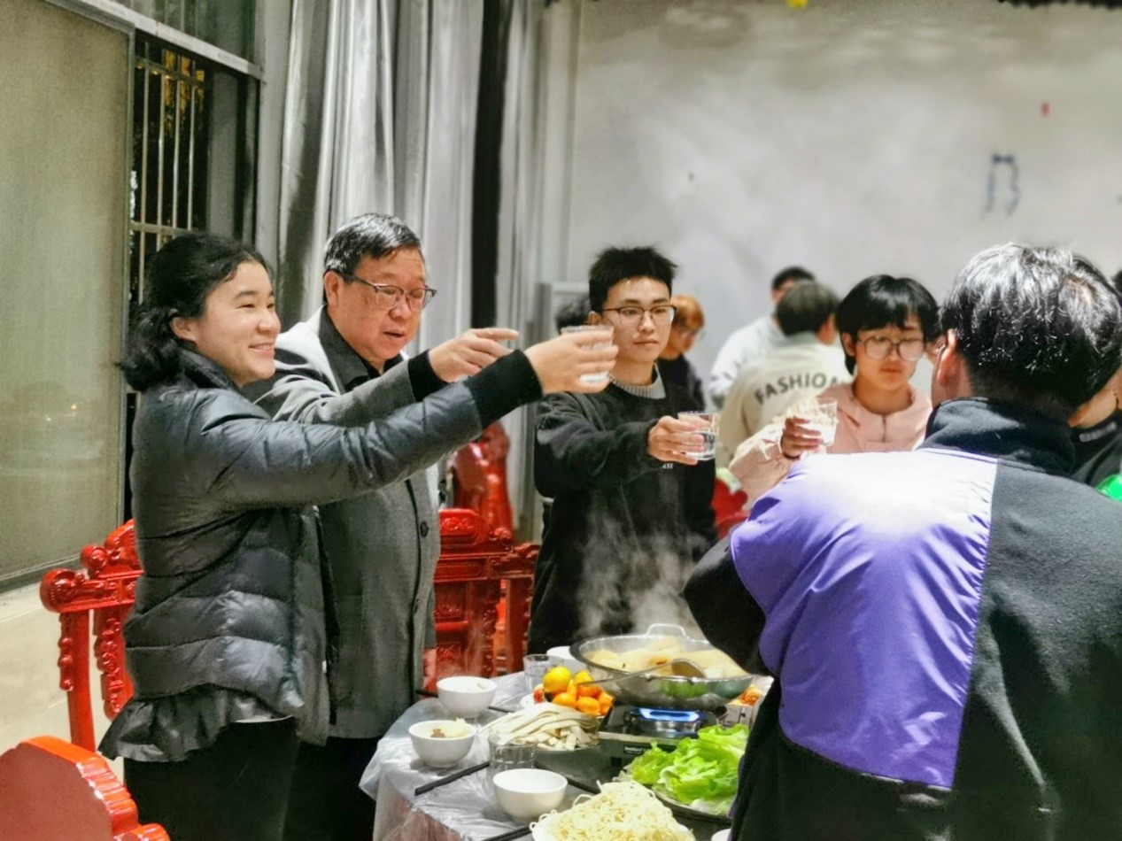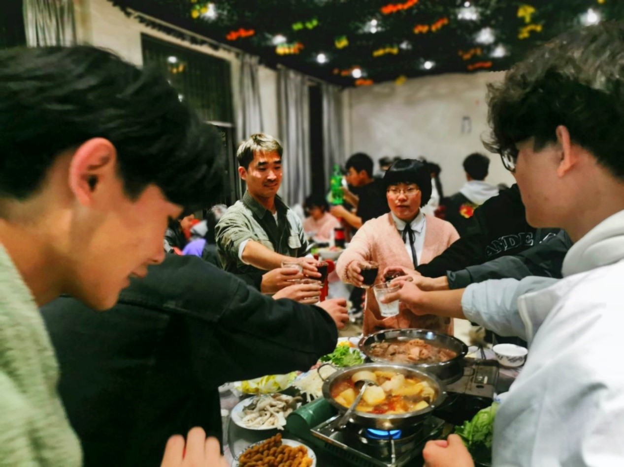 虽然室外寒意料峭,但宴会现场却是暖意融融,同学们,一边畅谈,一边享受美食。“火锅好吃吗?”“好吃!“同学们毫不犹豫大声地回答,现场欢笑一片。