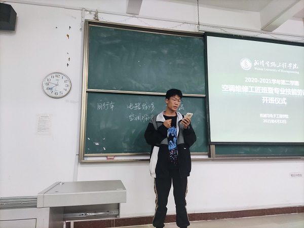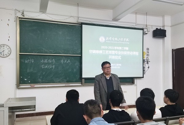 本网讯(通讯员 邢镪 摄影 江小龙)4月22日下午,我院在机电学院409教室召开空调维修工匠班暨专业劳动技能课程开班仪式。学院党总支书记、院长范超毅支持会议。学院党总支副书记宋颖颖,指导教师周德魁、苏晓聪,结业学生代表以及报名课程的学生参加本次会议。