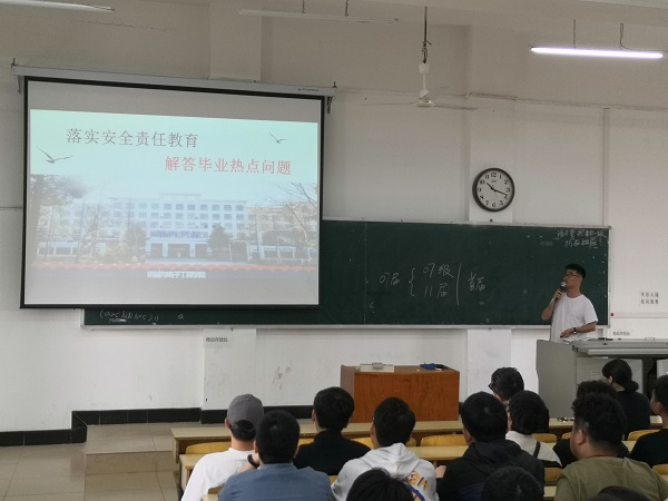 会上,毕业年级负责人许建新以“落实安全责任教育,解答毕业热点问题”为切入点,详实地向在座即将毕业的本科学生讲解了诸如:毕业生档案,党、团组织关系转接等学生自身需要密切关注的问题,并为他们现场答疑解惑。机电学院院长助理冉亮则表示,毕业答辩是为了展现能力、验明正身和弥补不足,并从这三大方面讲解了答辩的注意事项。