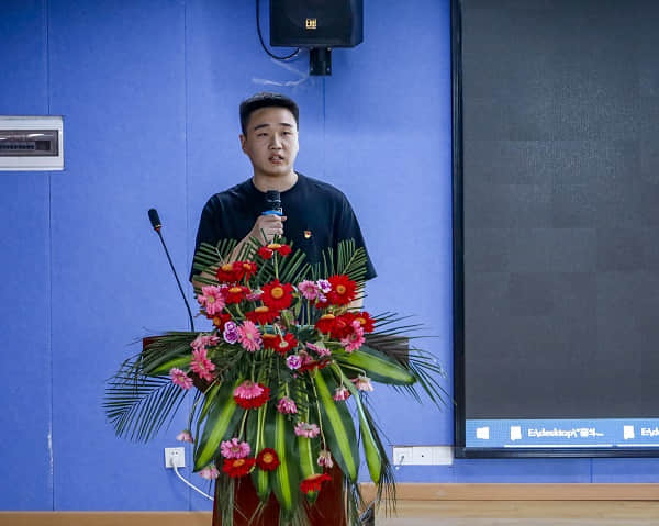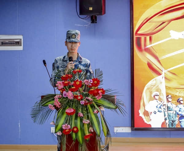 张奥昀同学讲道,自己曾服役于中国人民解放军火箭军。他表示,火箭军战士常年与导弹和发射器为伍,远离繁华都市,默默地为国防安全做贡献,虽条件艰苦,但伙食不错。同时他号召在座同学都应当参军入伍,担当时代责任和使命,到祖国需要的地方去,实现个人价值和梦想。