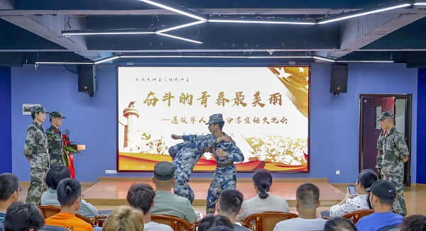 王文浩同学则表示自己曾服役于新疆兵团武警,并对自己有幸参加过非战争重大军事任务活动而感到无比自豪。在面对许多人询问他当兵苦不苦、累不累时,他则表示,青春就是用来奋斗,将来青春是用来回忆的,并于现场播放视频和图片展示训练细节。