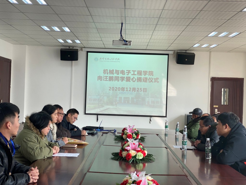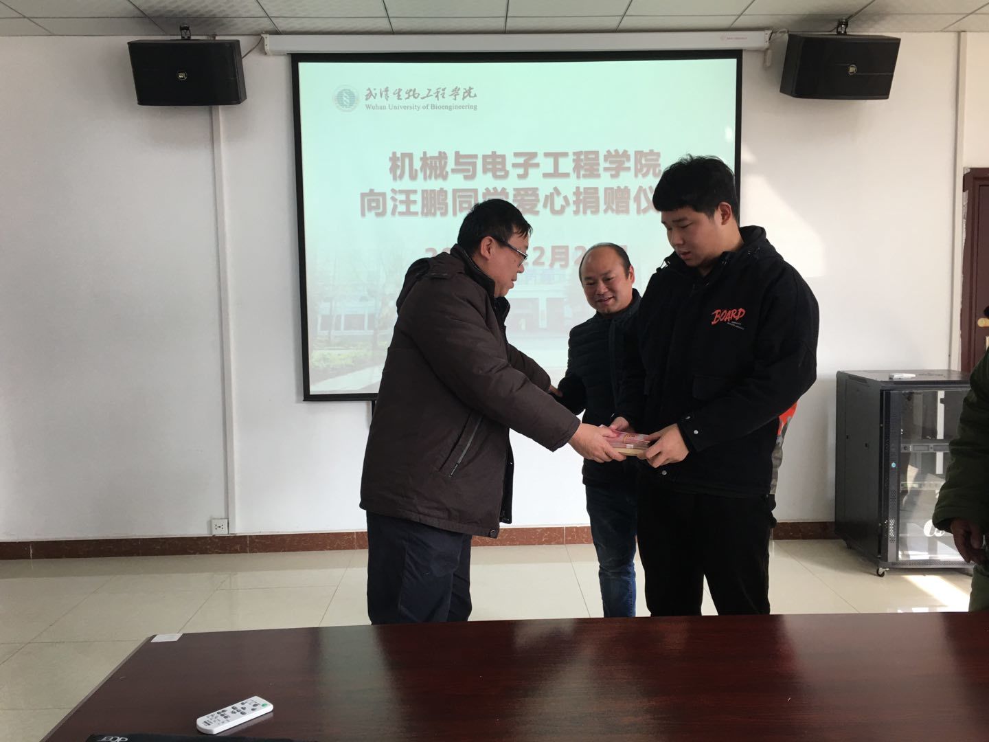 本网讯(通讯员 张鑫)2020年12月25日,机械与电子工程学院为患病学生汪鹏举行善款捐赠仪式。学院党总支书记、院长范超毅,党总支副书记宋颖颖,学校资助中心姜天燕老师等学校相关人员以及汪鹏同学的爷爷奶奶、大姑父、伯父出席了仪式。