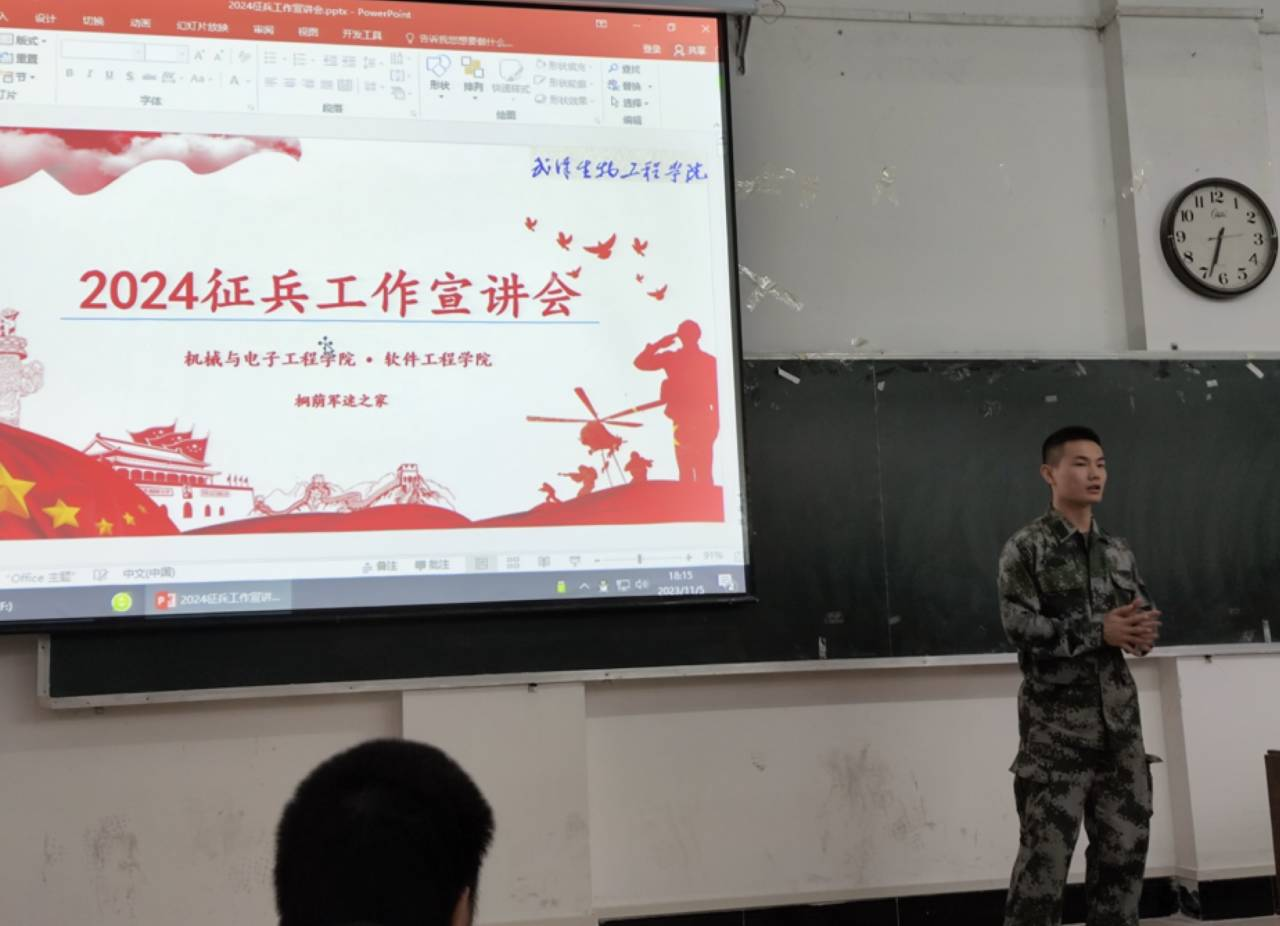 本网讯(通讯员 吴昫 摄影 许延)为深入贯彻落实征兵工作有关精神,鼓励和引导大学生积极应征入伍,激发学生报效祖国,献身国防的热情,11月5日晚17:30,机电·软件学院桐荫军迷之家开展了2024年征兵宣讲。