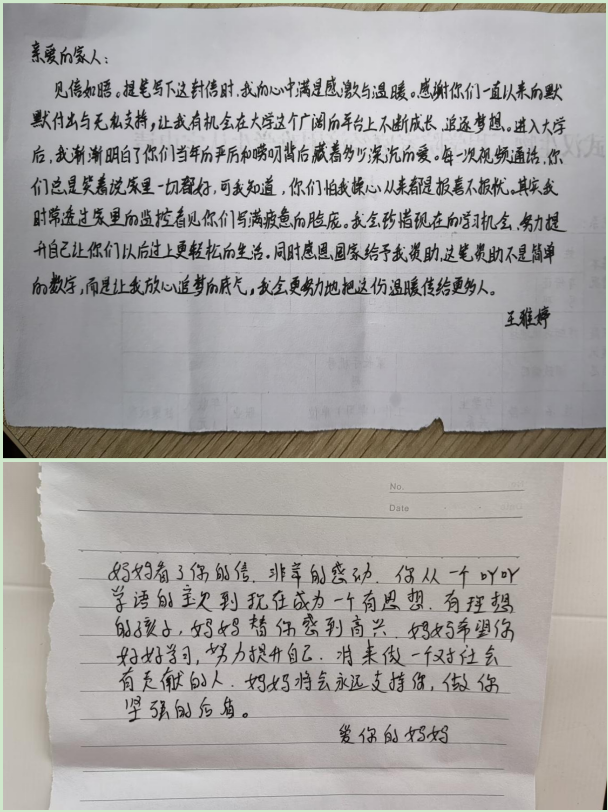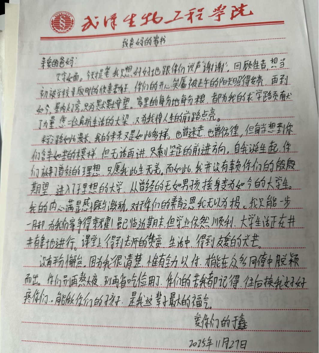 学生们在书写与倾诉中回望成长历程,感念亲情温暖,铭记资助关怀。学院通过前期宣传动员,鼓励同学们以传统纸质书信或现代电子文档为载体,将大学时光里的学业收获、思想蜕变、生活点滴娓娓道来。同学们在信中细数课堂上的知识积累、实践中的能力提升、社团活动中的成长蜕变,真诚分享获得奖助学金时的感动与期许,更将对父母养育之恩的感激、对家人默默支持的牵挂、对未来学业与人生的规划一一诉诸笔端。