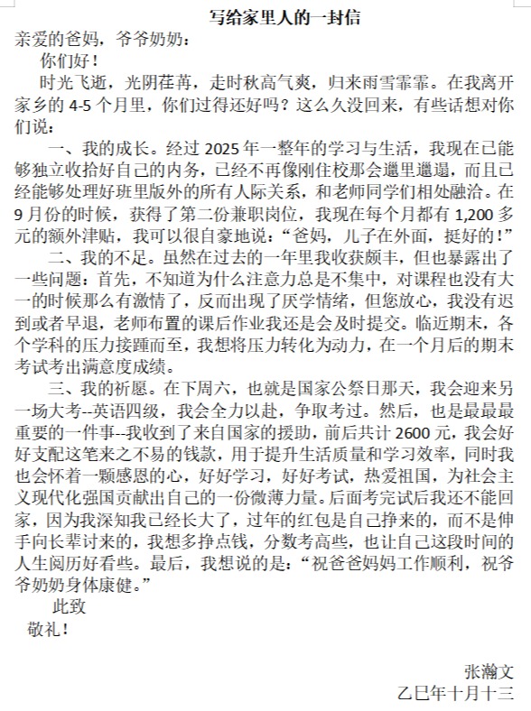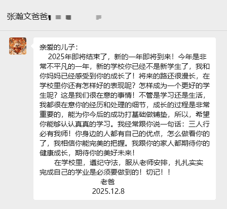 2024级机制1班张瀚文的家书及家长回信(辅导员:余宁霞)