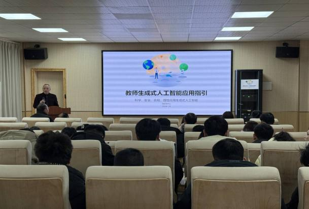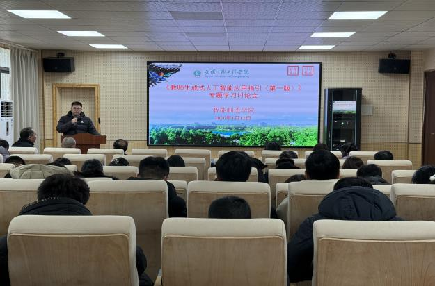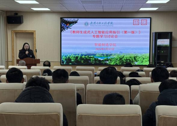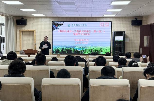 本网讯(通讯员 陈建雄)为落实学校干部教师人工智能应用能力培养及数字素养2026年考核要求,1月12日,智能制造学院在16#121报告厅开展《教师生成式人工智能应用指引(第一版)》专题学习会。教务处向乾坤、督导室胡学芝莅临指导,智能制造学院全体教职工参会。会议由张予川院长主持,副院长曹大有主讲。
